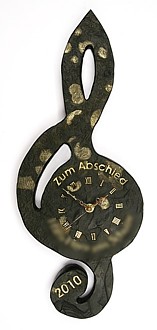 "Notenschlüssel und Uhr sehen viel besser aus als ich gedacht habe. Hierfür nochmals recht herzlichen Dank. Werde sie weiter empfehlen, muß nochmal sagen echt toll was sie vollbracht haben, sollte ich wieder sowas in der Art benötigen melde ich mich wieder bei Ihnen.Bis dahin MfG A. W."